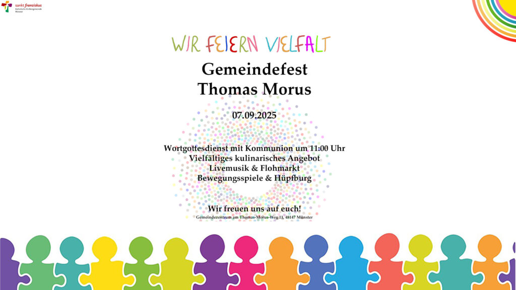 Wegen zahlreicher Termin-Kollisionen (Kommunalwahlen, Münster-Marathon…) feiern wir in diesem Jahr das Thomas-Morus-Fest nicht am dritten Sonntag im September, sondern schon